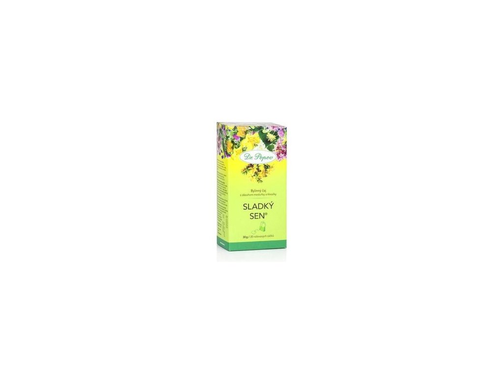 Kedy piť bylinný čaj Sladký sen:Bylinný čaj Dr. Popova Sladký sen® v sebe spája silu tradične používaných relaxačných bylín. Medovka a ľubovník sú známe svojimi účinkami na dobrú náladu, psychickú vyrovnanosť a napomáhajú ľahšiemu zaspávaniu. Levanduľa s mätou podporujú zdravý spánok. Čaj ďalej obsahuje železník a hluchavku.