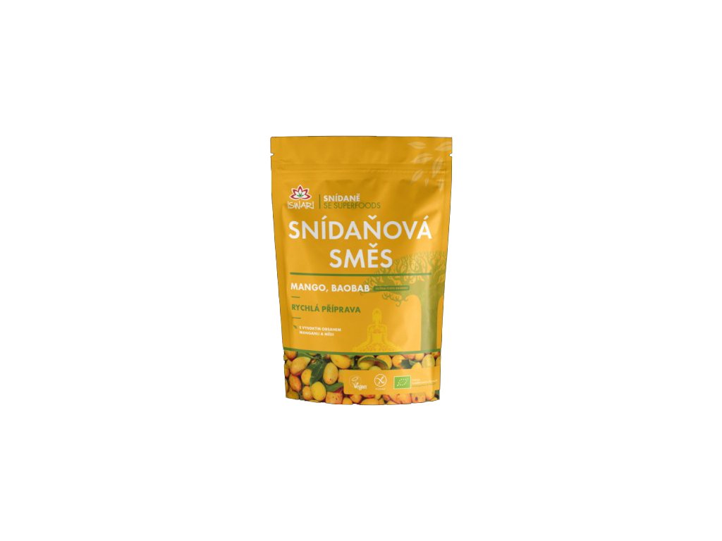 Zloženie:bio mletá pohánka, bio mletá ľanové semienka, bio mletá semienka chia (Salvia hispanica), bio vločky manga (10 %), bio mleté mandle, bio semienka pohánky, bio kokosový cukor, bio baobab prášok (dužina ovocia) (6,5 % )