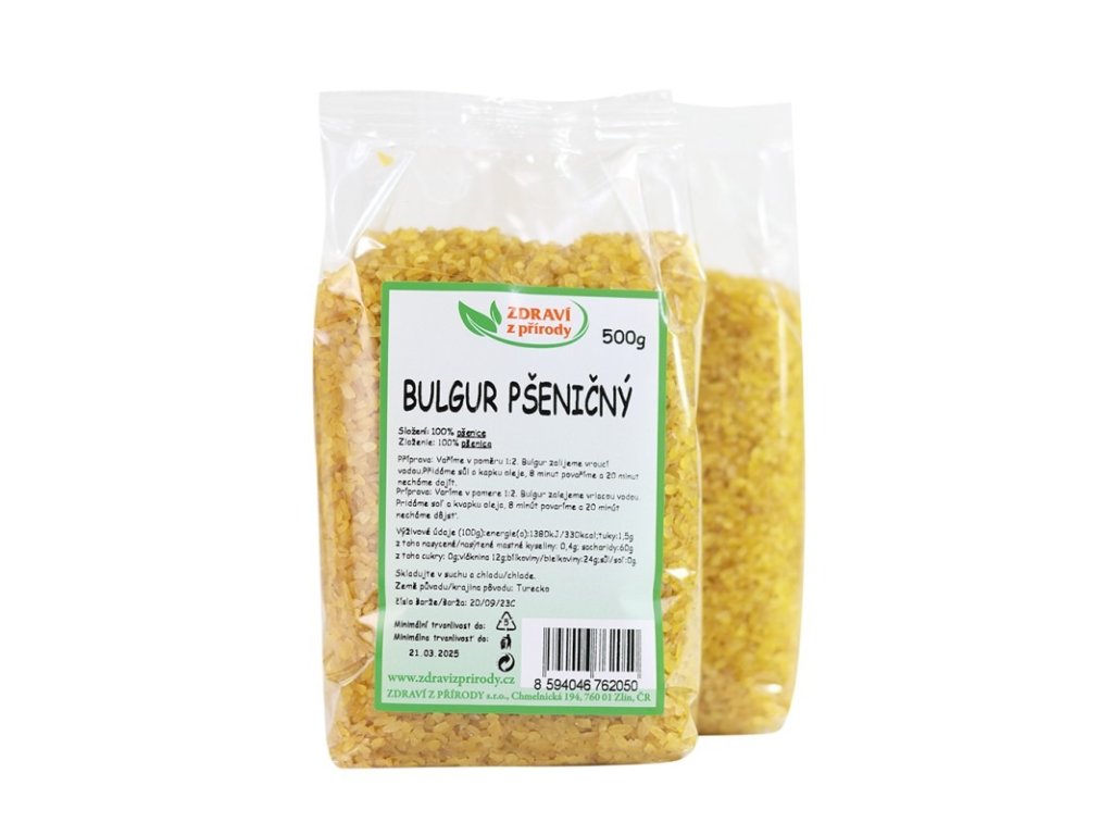Pšeničný bulgur je predvarená a jemne rozdrvená pšenica, ktorá sa vyrába z celých, nerozbrúsených zŕn tvrdej pšenice. Bulgur sa stáva neodmysliteľnou súčasťou dnešnej kuchyne, dá sa použiť pri príprave ako slaných tak sladkých chutných a výživných jedál a pokrmov. Bulgur je bohatý na rastlinné bielkoviny, sacharidy a tuky, vlákninu, vitamíny A, D, E, K, C, B1, B2, B3, B6, B9 a PP a minerály vápnik, železo, draslík, fosfor, sodík, horčík, zinok, meď, mangán aZloženie: