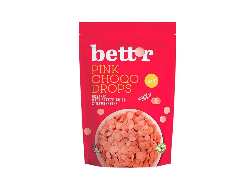Pink Choqo drops od Bett’r sú jemné ružové kvapky s neodolateľnou ovocnou arómou. Kokosový krém vyvažuje intenzívnu chuť kakaového masla a organický jahodový prášok dodáva ovocnú chuť a ružovú farbu. Ružové kvapky sú bez umelých farbív, bez živočíšnych produktov, sladené nerafinovaným trstinovým cukrom. Sú krásnym a lahodným akcentom pre váš dezert.Uchovávajte na chladnom, suchom a tmavom mieste.
