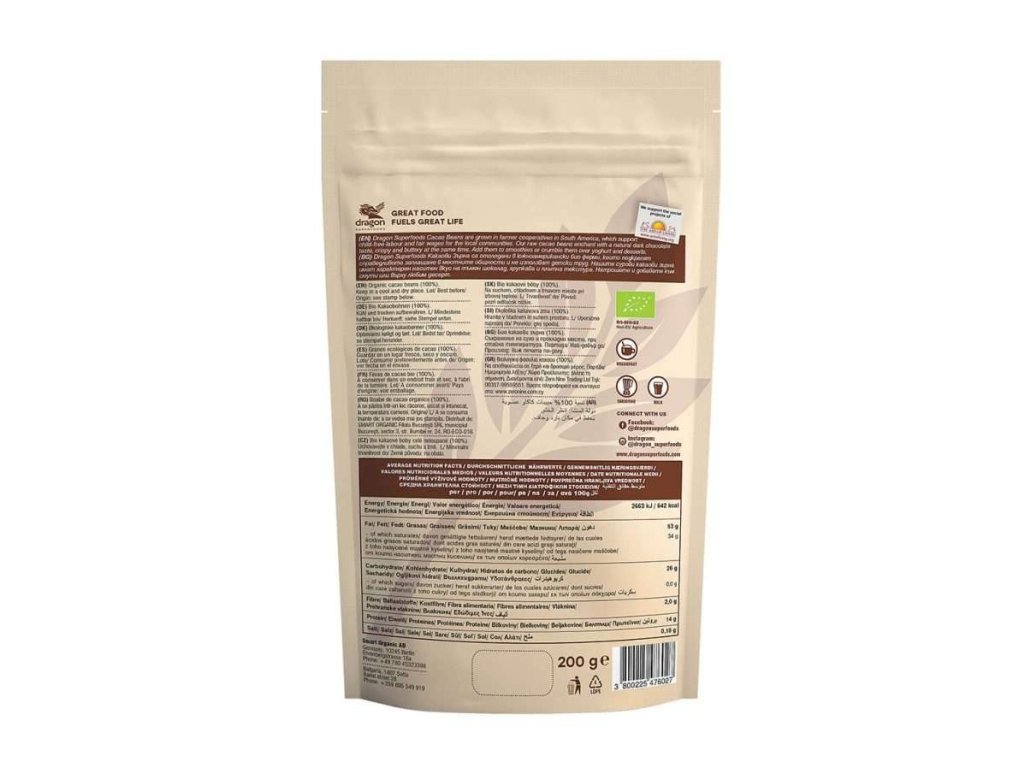 Dragon Superfoods Cacao Beans sa pestujú vo farmárskych družstvách v Južnej Amerike, ktoré podporujú prácu bez detí a spravodlivé mzdy pre miestne komunity. Naše surové kakaové bôby očaria prirodzenou chuťou tmavej čokolády, chrumkavou a maslovou zároveň. Pridajte ich do smoothies alebo ich rozdrobte na jogurt a dezerty.Uchovávajte na chladnom a suchom mieste.
