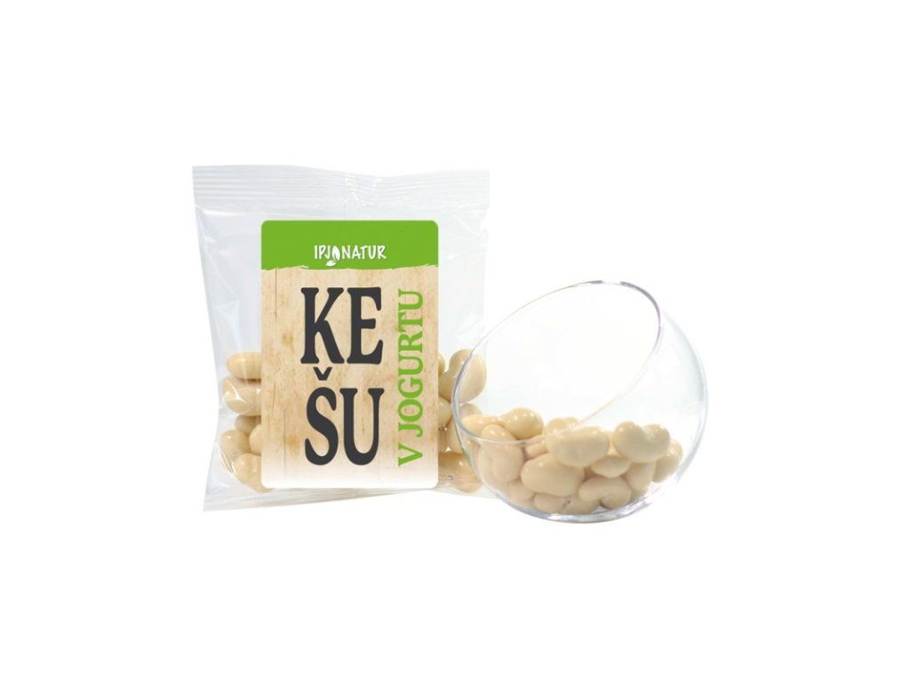 Kešu v jogurte sú kombináciou lahodných sladkastých obľúbených kešu orechov s jemne sladkokyslou krémovou jogurtovou polevou. Kešu v jogurte sú výborným variantom originálneho rýchleho občerstvenia, vhodnou alternatívou pre rýchlu desiatu, pre pohostenie, pri chuti na niečo sladké alebo v studenej kuchyni na prípravu a dekoráciu dezertov.Kešu sú plody Ľadvinovníka západného, ??ktorý pôvodne rástol na území Brazílie. Kešu sú veľmi bohaté na bielkoviny a omega-3 a omega-6 nenasýtené kyseliny. Pre svoju krémovú konzistenciu a sladkastú chuť sú vyhľadávanou a obľúbenou potravinou. Obsahujú vitamíny a minerály a sú významným zdrojom horčíka.