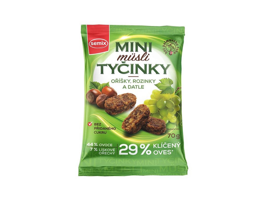 Mini müsli tyčinky sú bezlepkové sušené tyčinky, ktoré sú vďaka naklíčenému ovsu, ktorý je hlavnou zložkou müsli, nielen chutné, ale predovšetkým lepšie stráviteľné. Navyše neobsahujú žiadne pridané cukry, ale naopak veľké množstvo ovocia a vlákniny. Sú tak nielen veľmi chutnou, ale aj výdatnou a zdravou desiatou.Ovos je obilie najbohatšie na živiny. V hojnom množstve obsahuje fosfor, železo, vitamín B1, zinok, horčík, ďalej obsahuje škrob a fruktózu, vitamíny skupiny B, E, fosfor, horčík, železo a antioxidanty.