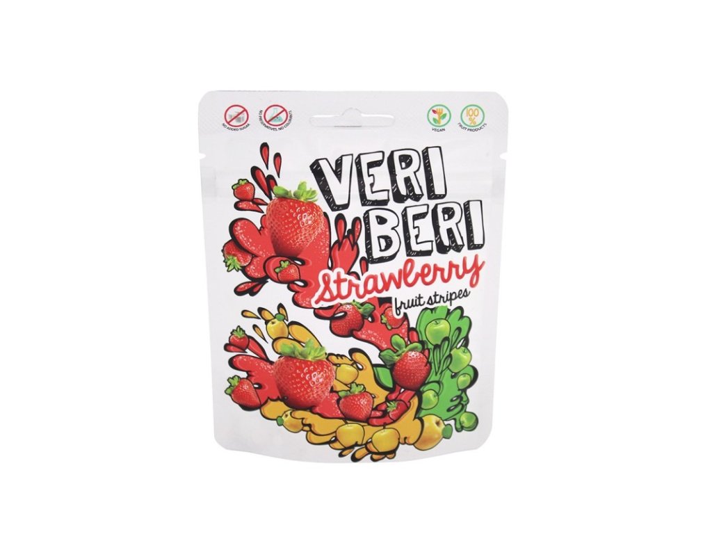 Ovocné pásky z radu Veri Beri sú lahodnou ovocnou pochoutkou s výraznou chuťou jahod. Majú jemnú žvýkaciu predstavu a sú ideálne ako sladká svačina pre deti i dospelé. Praktické balenie je vhodné na cesty, do školy i do práce. Na rozdiel od klasických cukroviniek sú ovocné plátky vyrobené z prírodných surovín tej najvyššej kvality, bez chemických náhražok a konzervantov, umelých farbív a aromat. Balení "zip-lock" pre opakované otvorenie zachovává obsah vždy čerstvý a chutný.Zloženie: