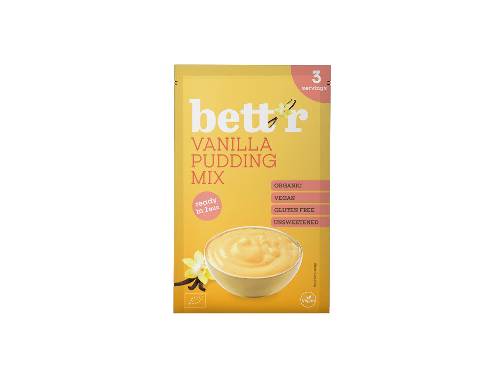 Zmes na vanilkový puding Bett'r teraz v praktickom 30g vrecku. 3 porcie, hotové za minútu!Jeho receptúra pozostáva len z niekoľkých ingrediencií, je bezlepková a bez umelých aróm. Neodolateľná vanilková chuť a aróma sú výsledkom pridanej organickej bourbonovej vanilky, vďaka čomu je produkt úplne vhodný pre malé deti.
