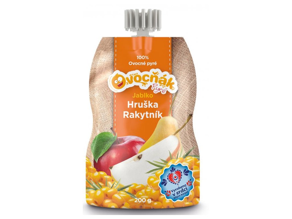 Toto pyré bude chutiť deťom aj dospelým. Že vás nenapadlo niekedy jesť pyré? A skúsili ste ho? V tejto kombinácii totiž sladké, krémové hrušky dopĺňa stredne kyslý rakytník a sviežosť dodávajú šťavnaté jablká. V každom súste (alebo loku?) je toľko zábavných chutí, že z neho budú nadšené deti i dospelí. A všetci budú profitovať z ich zdravotných predností.Rakytník je považovaný za zlato severu, má veľmi vysoký obsah vitamínu C a ako jediný zástupca flóry má kompletný obsah aminokyselín. Radí sa medzi superpotraviny a je výborný na podporu imunity. Naproti tomu hruška pomáha doplniť energiu a vodu do nášho organizmu. Zaháňa pocit smädu a vďaka prevládajúcej fruktóze ju veľmi dobre znáša diabetici. Rakytník taktiež obsahuje celú škálu dôležitých minerálov ako je draslík, horčík a železo.
