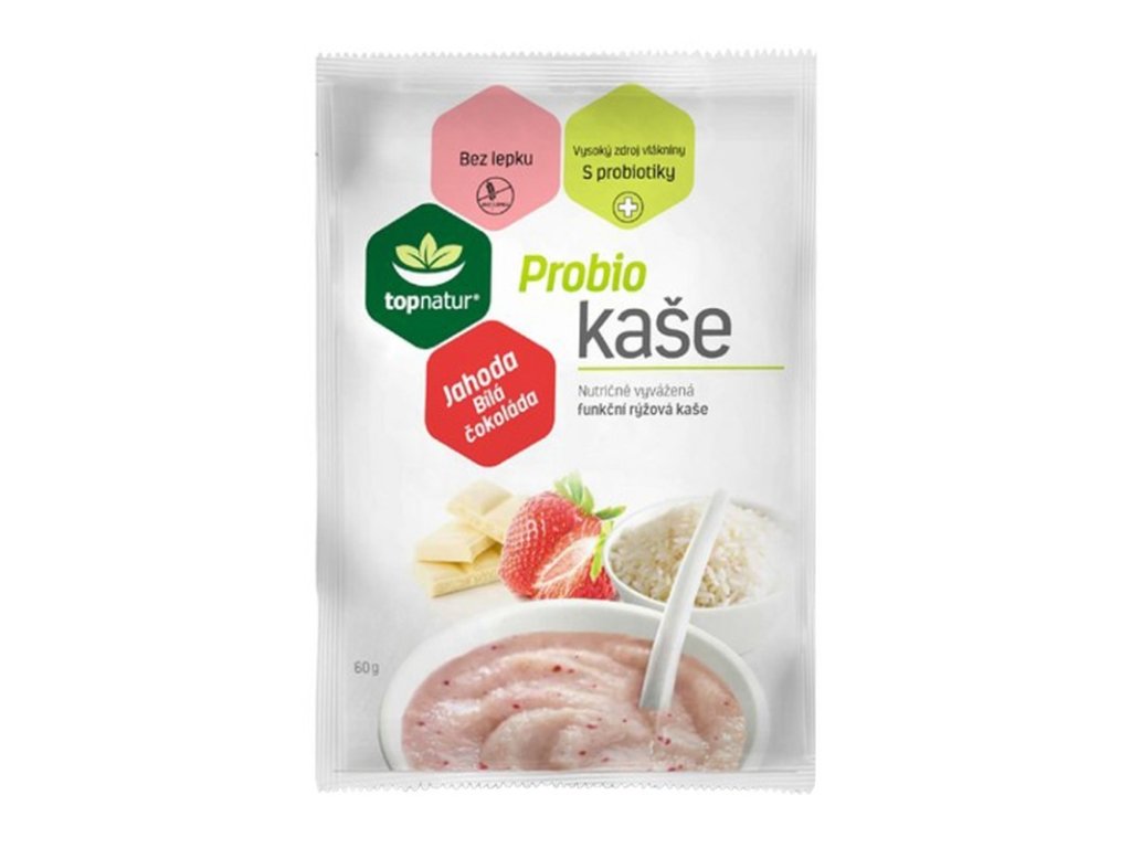 Bezlepková Probio kaša s jahodami a bielou čokoládou je funkčná ryžová kaša s príchuťou jahôd a bielej belgickej čokolády.Probio kaše sú jedinečné kaše obohatené o probiotické kmene. Obsahujú prebiotickú vlákninu inulín, ktorá je veľmi dôležitá ako živný substrát pre rast probiotických kultúr obsiahnutých v kaši. Probio kaše obsahujú aj vitamíny a minerály, najmä A, B1, B6, B12, C, D3, vápnik, horčík, fosfor, selén, železo, niacín. Kaša neobsahuje lepok a je tak vhodná pre ľudí s výživovým obmedzením a pre záujemcov o racionálne stravovanie. Probio kaše sú vhodné pre rekonvalescentov a športovcov rovnako ako pre osoby s bezlepkovou diétou, pre seniorov a môžu ich konzumovať aj deti.