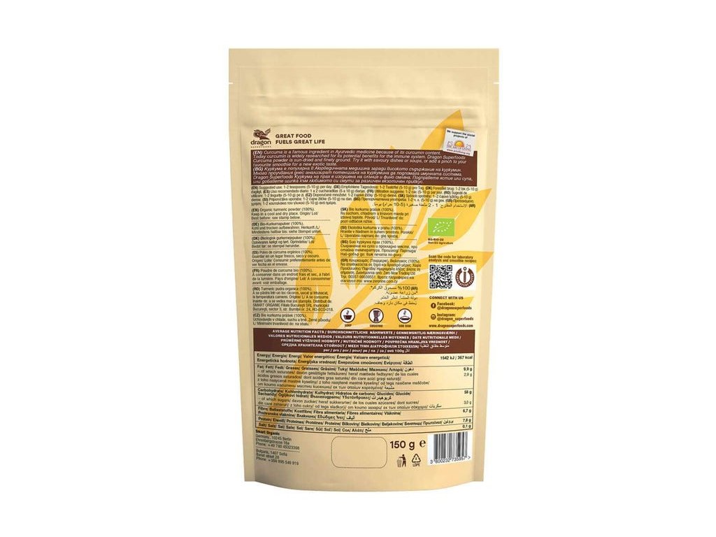 Kurkuma je známa zložka ajurvédskej medicíny kvôli jej obsahu kurkumínu.Dnes je kurkumín široko skúmaný pre svoje potenciálne prínosy pre imunitný systém. Dragon Superfoods Curcuma prášok je sušený na slnku a jemne mletý. Vyskúšajte to so slanými jedlami či polievkami alebo pridajte štipku do svojho obľúbeného smoothie pre novú exotickú chuť.
