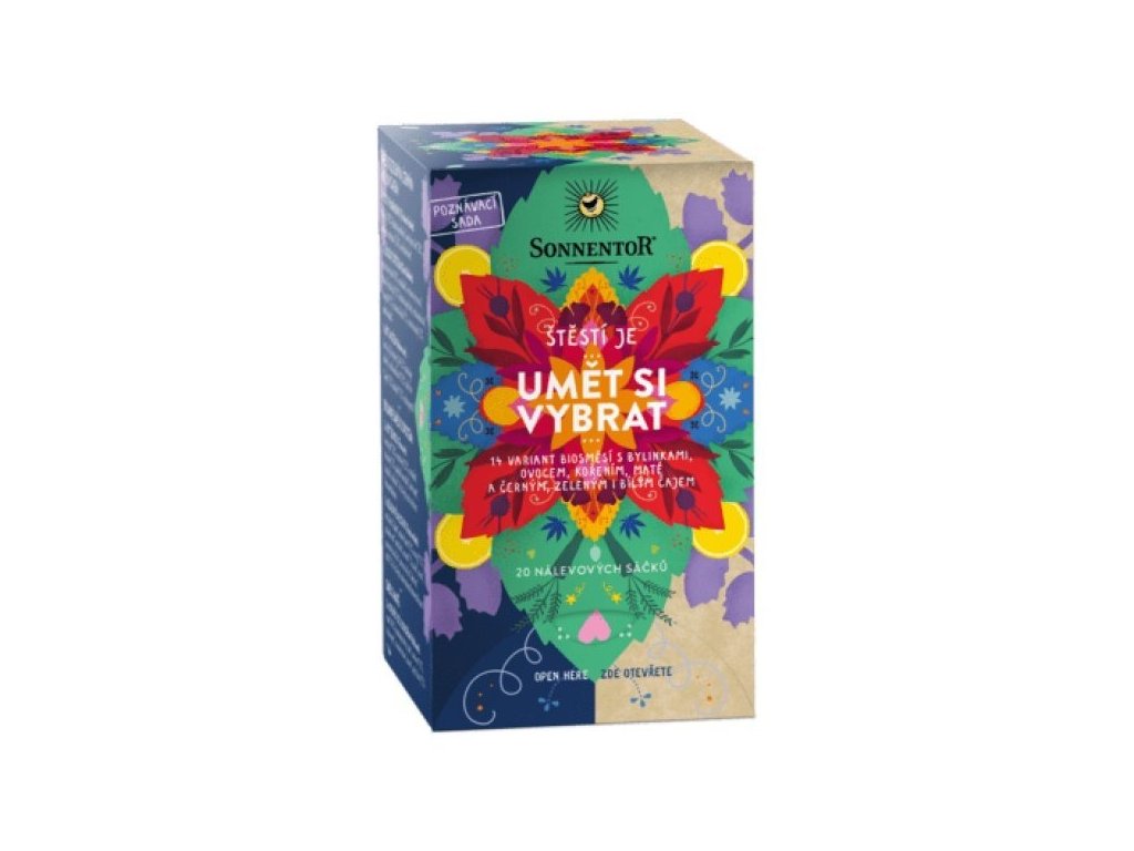 "Šťastie je...vedieť si vybrať" Ochutnajte všetkých 12 jedinečných zmesí od korenenej až po sviežu ovocnú. Nájditešťastie v šálke čaju. 12 druhov bio zmesí v poznávacej sade, ktorá obsahuje 20 nálevových vreciek. Pre uchovanie