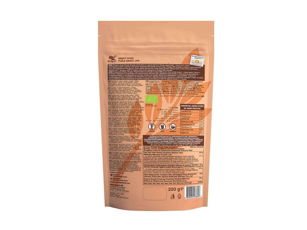 Dragon Superfoods Energy Smoothie je skvelá zmes troch superpotravín - koreňa macy, kakaa a konopného proteínu, nutričná zmes, ktorá podporuje vitalitu tela. Prášok Energy Mix sa ľahko skladuje a používa.Zažijete typickú kakaovú chuť a arómu, orieškovú chuť konopného proteínu a náznak jemnej macy. Jednoducho zmiešajte 1 banán, 200 ml vegánskeho mlieka a 2 čajové lyžičky prášku Energy Mix.