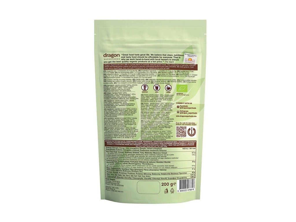 Dragon Superfoods Det’x Mix je skvelá zmes starostlivo vybraných zelených potravín. Kombinácia spiruliny, chlorelly, pšenice a jačmennej trávy robí z nášho produktu dokonalú chlorofylovú posilu do vášho každodenného smoothie. Zmiešajte listovú zeleninu, čerstvé ovocie a tekutý základ, potom už len pridajte 2 čajové lyžičky našej zmesi superpotravín a dobre premiešajte.Odporúčané dávkovanie: 1-3 čajové lyžičky (10-15g) denne.