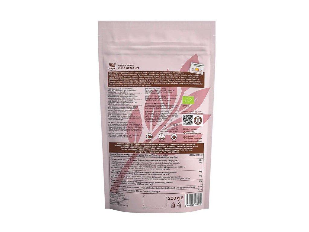 Dragon Superfoods Karobový prášok sa vyrába zo sušených, pražených strukov rohovníka.Tieto struky sú prirodzene sladké a majú vysoký obsah vlákniny. Karobový prášok sa často používa ako bezkofeínová alternatíva kakaa v rôznych nápojoch a dezertoch. Stačí pridať pár polievkových lyžíc do vášho obľúbeného receptu na koláč, zmrzlinu alebo krémový puding!