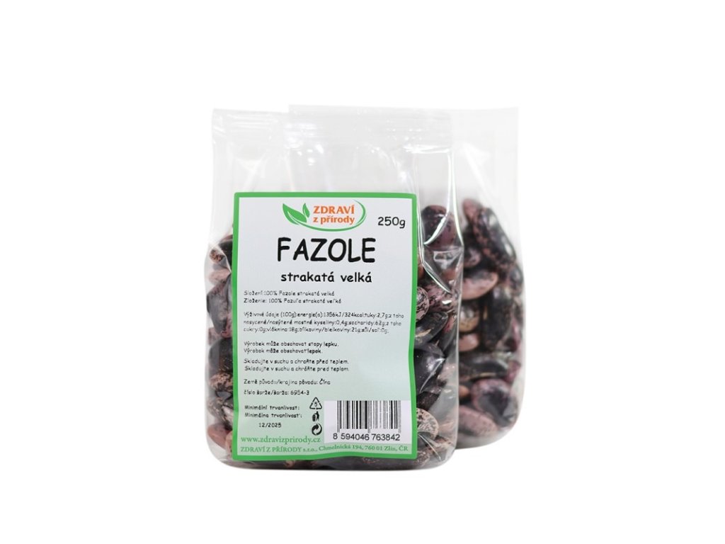 Veľká strakata fazuľa je fazuľa obličkovitého tvaru a hnedo - čiernej farby. Obsahujú veľké množstvo bielkovín, vitamíny skupiny B a vitamín E. Okrem toho je fazuľa bohatá na fosfor, draslík, horčík, vápnik, a železo a lecitín. Veľké farebné fazule sa nerozvarujú a je možné ich kombinovať napríklad s bielymi fazuľamiZloženie: