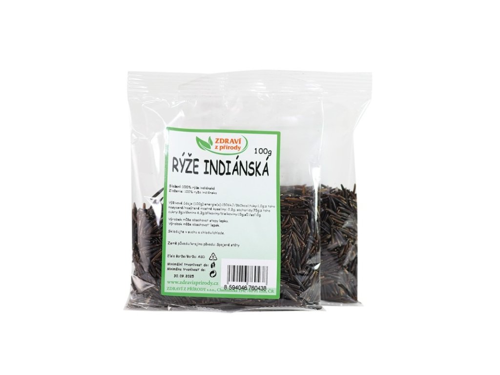 Indiánska ryža je známa aj pod názvom divoká ryža a je bohatá na sacharidy, vitamíny skupiny B, bielkoviny, minerály, vlákninu, omega 3 a 6 mastné kyseliny. Obsahuje aj esenciálnu aminokyselinu lyzín, ktorá je dôležitá pre stavbu bielkovín, budovanie svalov, vstrebávanie vápnika či pri hojení. Svojou čiernou farbou a orieškovou chuťou robí jedlá nielen zaujímavé chuťovo, ale aj esteticky.Zloženie: