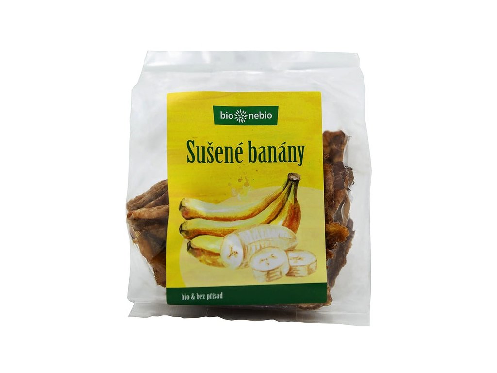 Zrelé sladké banány vypestované bez použitia syntetických hnojív a pesticídov boli pozdĺžne nakrájané na tenké plátky a šetrne usušené bez prídavku cukru či tuku. Nie sú sírené, a preto majú hnedastú farbu. Sú vynikajúce ako zdravá desiata, na doplnenie energie pri športe alebo ako súčasť stolných zmesí orieškov a sušeného ovocia. Hodí sa tiež na ozdobenie banánového chleba či muffinov pred pečením a do dezertov.Zloženie: