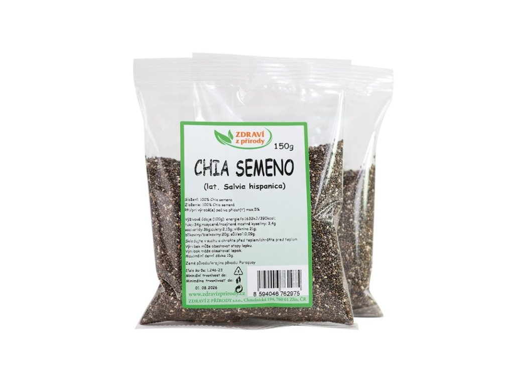 Jedná sa o drobné semienka šalvie hispánskej (salvia hispanica), pôvodne pochádzajúce z Latinskej a Strednej Ameriky. V minulosti patrili semienka chia k hlavným potravinám bájnych Aztékov (tiež nazývané semienka bežcov). Chia semienka majú ohromné ??hydrofilné vlastnosti (tj dokážu na seba nadviazať toľko vody, že zväčšia svoj objem až 12x. To má za následok to, že telo je skvele hydratované zvnútra, čo má priaznivý vplyv na akúkoľvek fyzickú záťaž). Okrem hydrofilných vlastností chia semienka obsahujú proteíny, kvalitné sacharidy, omega 3-mastné kyseliny (priaznivo pôsobia na kardiovaskulárny systém), sú výdatným zdrojom vlákniny, vápnika, antioxidantov, prirodzeným zdrojom železa, zinku, fosforu, magnézia a ďalších dôležitých živín. Hydrofilné vlastnosti chia semienok umožňujú vytvoriť jemný a ľahko stráviteľný gél, ktorý v tele významne znižuje hladinu krvného cukru. Chia semienka neobsahujú lepok. Používanie chia semienok sa neodporúča ľuďom s nízkym tlakom a tým, ktorí užívajú lieky na riedenie krvi a vitamín B17.Dávkovanie: odporúčaná denná dávka pri balených semenách chia je 15g.