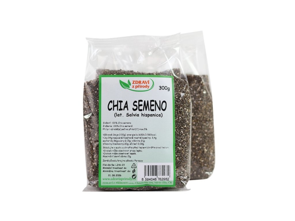Jedná sa o drobné semienka šalvie hispánskej (salvia hispanica), pôvodne pochádzajúce z Latinskej a Strednej Ameriky. V minulosti patrili semienka chia k hlavným potravinám bájnych Aztékov (tiež nazývané semienka bežcov). Chia semienka majú ohromné ??hydrofilné vlastnosti (tj dokážu na seba nadviazať toľko vody, že zväčšia svoj objem až 12x. To má za následok to, že telo je skvele hydratované zvnútra, čo má priaznivý vplyv na akúkoľvek fyzickú záťaž). Okrem hydrofilných vlastností chia semienka obsahujú proteíny, kvalitné sacharidy, omega 3-mastné kyseliny (priaznivo pôsobia na kardiovaskulárny systém), sú výdatným zdrojom vlákniny, vápnika, antioxidantov, prirodzeným zdrojom železa, zinku, fosforu, magnézia a ďalších dôležitých živín. Hydrofilné vlastnosti chia semienok umožňujú vytvoriť jemný a ľahko stráviteľný gél, ktorý v tele významne znižuje hladinu krvného cukru. Chia semienka neobsahujú lepok. Používanie chia semienok sa neodporúča ľuďom s nízkym tlakom a tým, ktorí užívajú lieky na riedenie krvi a vitamín B17.Dávkovanie: odporúčaná denná dávka pri balených semenách chia je 15g.