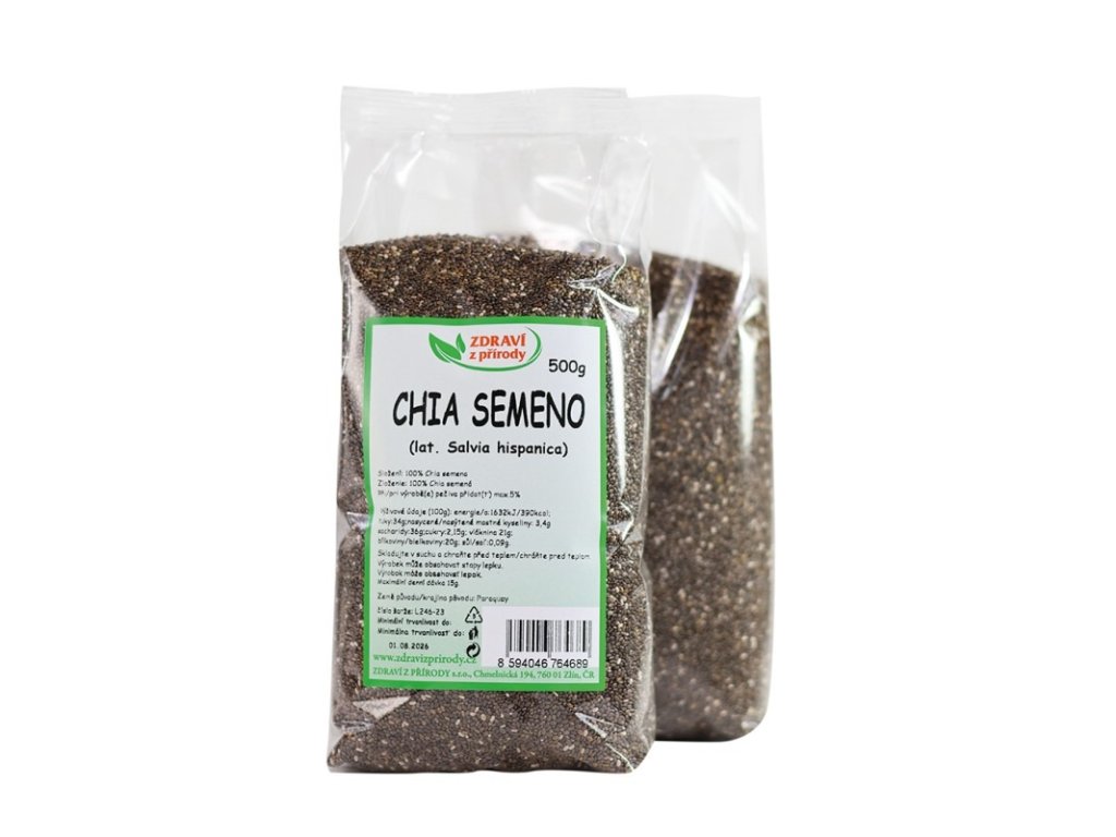 Jedná sa o drobné semienka šalvie hispánskej (salvia hispanica), pôvodne pochádzajúce z Latinskej a Strednej Ameriky. V minulosti patrili semienka chia k hlavným potravinám bájnych Aztékov (tiež nazývané semienka bežcov). Chia semienka majú ohromné ??hydrofilné vlastnosti (tj dokážu na seba nadviazať toľko vody, že zväčšia svoj objem až 12x. To má za následok to, že telo je skvele hydratované zvnútra, čo má priaznivý vplyv na akúkoľvek fyzickú záťaž). Okrem hydrofilných vlastností chia semienka obsahujú proteíny, kvalitné sacharidy, omega 3-mastné kyseliny (priaznivo pôsobia na kardiovaskulárny systém), sú výdatným zdrojom vlákniny, vápnika, antioxidantov, prirodzeným zdrojom železa, zinku, fosforu, magnézia a ďalších dôležitých živín. Hydrofilné vlastnosti chia semienok umožňujú vytvoriť jemný a ľahko stráviteľný gél, ktorý v tele významne znižuje hladinu krvného cukru. Chia semienka neobsahujú lepok. Používanie chia semienok sa neodporúča ľuďom s nízkym tlakom a tým, ktorí užívajú lieky na riedenie krvi a vitamín B17.Dávkovanie: odporúčaná denná dávka pri balených semenách chia je 15g.