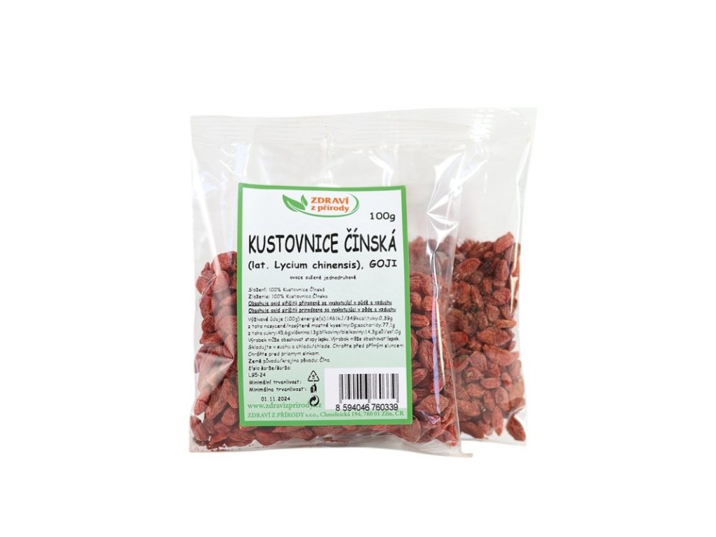 Sušené goji sú sušené plody kustovnice čínskej, konzumujú sa samotné ako mimoriadne zdravá desiata, alebo sa pridávajú do cereálnych zmesí, jogurtu a ďalších pokrmov. Sú výborným variantom originálneho rýchleho občerstvenia, vhodnou alternatívou pre rýchlu desiatu, pre pohostenie, pri chuti na niečo zaujímavé alebo ako originálne zakončenie po jedle.Goji sú sušené plody kustovnice čínskej. Obsahujú 18 druhov aminokyselín a až 21 stopových prvkov, medzi ktoré patrí zinok, železo, meď, vápnik, germánium, selén a fosfor. V porovnaní s inými plodmi sú Goji jedným z najbohatších zdrojov karotenoidov, obsahujú beta karotén, zeaxantín, luteín, lykopén, kryptoxantín a xantofyl. Z vitamínov obsahujú goji okrem iných hlavne vitamín C, B1, B2, B3, B6 a E.