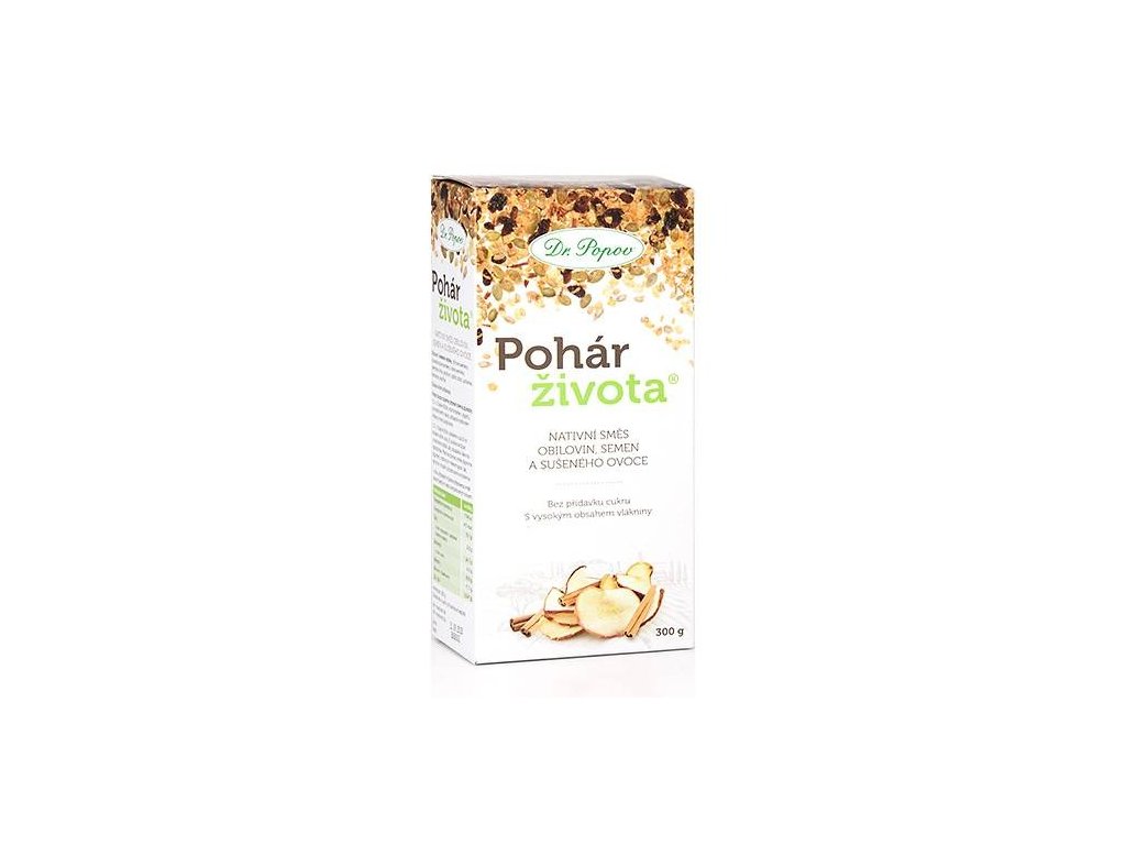 Lahodná natívna zmes obilnín, semien a sušeného ovocia, výborná ako raňajky alebo zdravá desiata. Ideálna na doplnenie energie, vhodná na prečistenie organizmu. Pohár života má vysoký obsah vlákniny a je bez pridaného cukru a konzervantov.Dávkovanie: