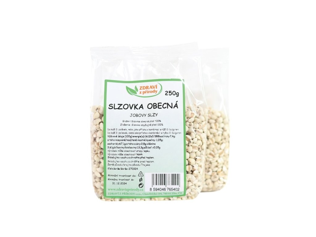 Slzovka obyčajná je jednoročná, liečivá, prirodzene bezlepková obilnina z čeľade lipnicovitých, ktorá má svoj pôvod v Ázii a ktorá je využívaná v čínskej medicíne. Slzovka disponuje vysokým obsahom vitamínov B, C a betakaroténu. Obsahuje tiež draslík, kalcium, horčík, železo, meď, mangán, fosfor a zinok. Má antioxidačné a detoxikačné účinky.Použitie: