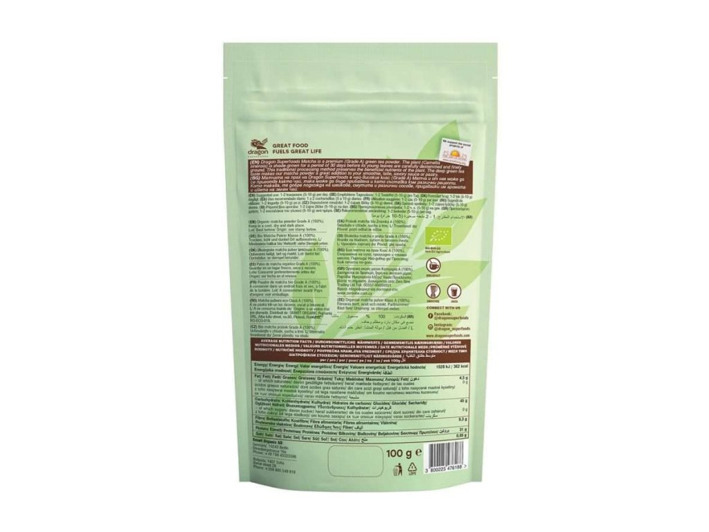 Dragon Superfoods Matcha je prémiový (trieda A) prášok zo zeleného čaju. Rastlina (Camellia sinensis) sa 30 dní pestuje v tieni, potom sa jej mladé listy opatrne odstopkujú a jemne pomelú. Tento tradičný spôsob spracovania zachováva prospešné živiny rastliny. Vďaka hlbokej chuti zeleného čaju je náš matcha prášok skvelým doplnkom do vášho smoothie, latte, slanej omáčky alebo pečiva.Odporúčané dávkovanie: 1-2 čajové lyžičky (5-10 g) denne.