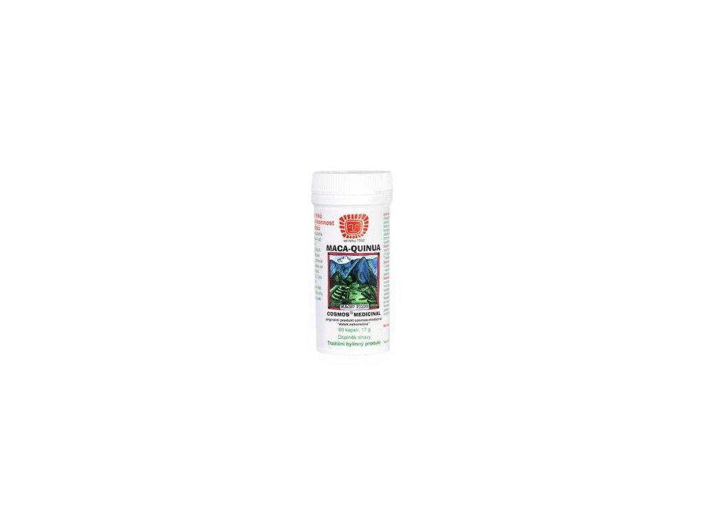 Mletý koreň Maca, mleté ??zrná Quinua v pomere 1:1 175 mg/kapsule, želatínové kapsule.