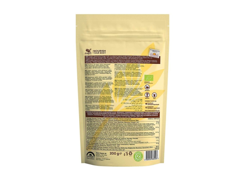 Dragon Superfoods Omega 3 Mix je zmes organických semienok prirodzene bohatých na omega-3 mastné kyseliny. Kombinácia drvených chia semienok, ľanu a lúpaných konopných semienok dodáva zmesi ľahkú a príjemnú orieškovú chuť. Dragon Superfoods Omega 3 Mix je vhodný na pridávanie do smoothies a posypanie šalátov.Odporúčané použitie: 2 polievkové lyžice (15 g) denne