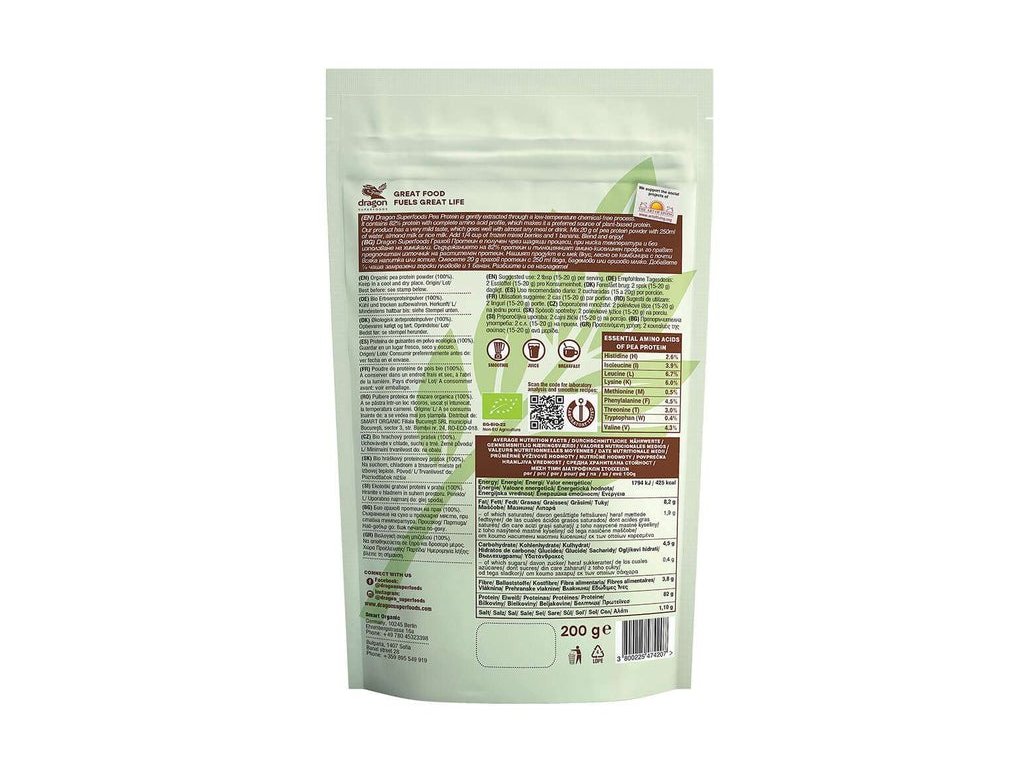 Hrachový proteín Dragon Superfoods je šetrne extrahovaný nízkoteplotným procesom bez chemikálií. Obsahuje 82 % bielkovín s kompletným aminokyselinovým profilom, čo z neho robí preferovaný zdroj rastlinných bielkovín. Náš produkt má veľmi jemnú chuť, ktorá sa hodí takmer ku každému jedlu alebo nápoju. Zmiešajte 20 g hrachového proteínového prášku s 250 ml vody, mandľového mlieka alebo ryžového mlieka. Pridajte 1/4 šálky mrazených zmiešaných bobúľ a 1 banán. Miešajte a užívajte si!Odporúčané použitie: 2 polievkové lyžice. (15-20 g) na porciu.