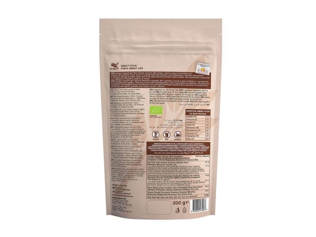 Dragon Superfoods Rice Protein obsahuje 86 % bielkovín, ktoré sa ľahko vstrebávajúobsahuje všetky esenciálne aminokyseliny. Je šetrne extrahovaný nízkoteplotným procesom bez chemikálií. 30-gramová dávka poskytuje približne polovicu denného referenčného príjmu bielkovín (dospelí). Odporúčame konzumovať v surovom stave, pridať do smoothie, jogurtu alebo cereálií.