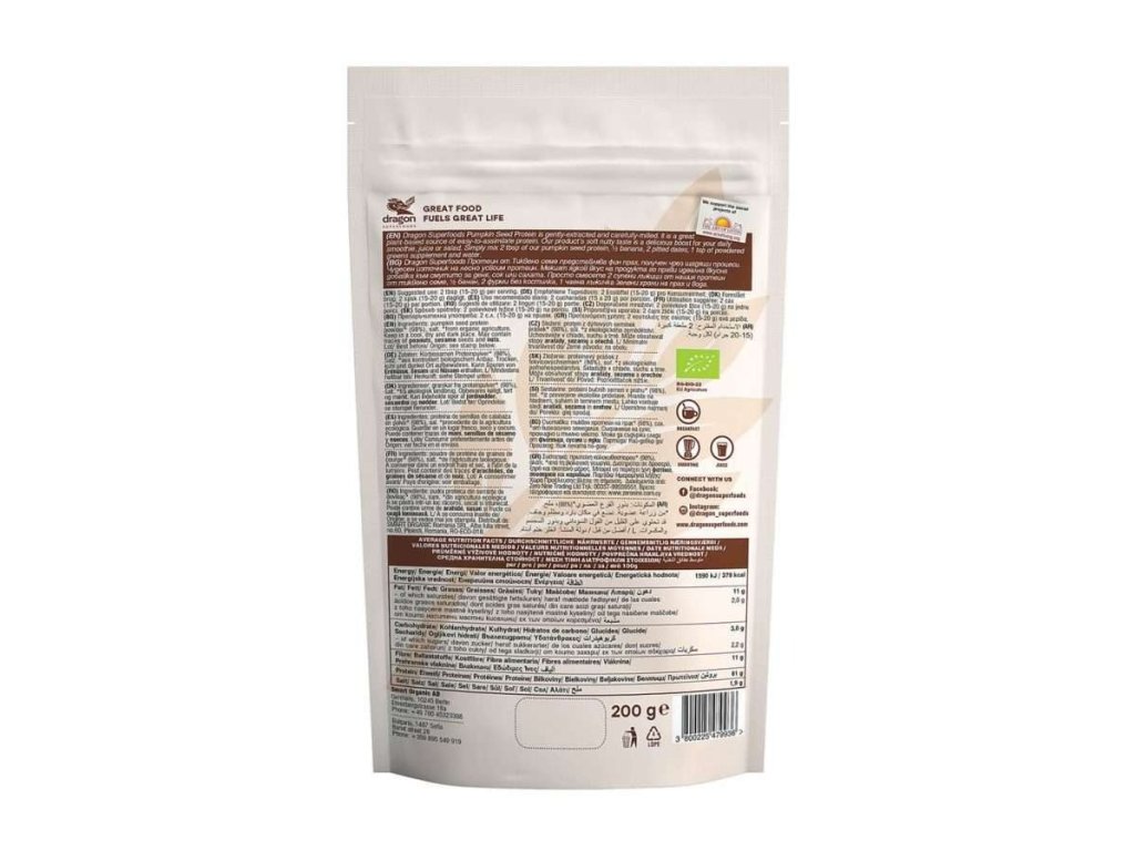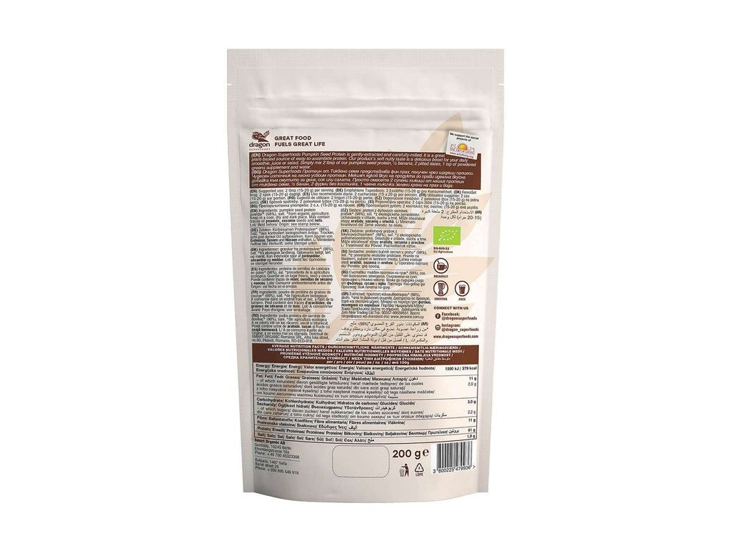 Dragon Superfoods Pumpkin Seed Protein je jemne extrahovaný a starostlivo mletý. Je to skvelý rastlinný zdroj ľahko asimilovateľných bielkovín. Jemná oriešková chuť nášho produktu je lahodnou posilou pre váš každodenný smoothie, džús alebo šalát. Jednoducho zmiešajte 2 polievkové lyžice. nášho proteínu z tekvicových semienok, 1 banánu, 2 vykôstkované datle, 1 lyžička práškového doplnku zelených plodov a voda.Odporúčané použitie: 2 polievkové lyžice. (15-20 g) na porciu.